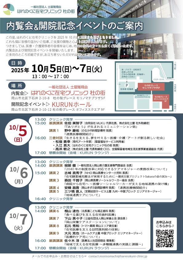 【10/5】 13:00 クリニック見学 15:00 ・基調講演 佐伯 美智子(合同会社 MUKU 代表社員、株式会社土屋 社外取締役) ・講演1 野中 慶佑(のなか内科腎診療所 院長)「連携医療機関紹介」 16:00 三者対談「生きるを支える、夢を叶える~医療・介護・アートが創る新しい社会」 ・松嶺 貴幸(現代アート作家)(障害福祉サービス利用者) ・入江 真大(はれのくに在宅クリニック杜の街 院長) ・高浜 敏之(株式会社土屋 代表取締役 CEO、全国障害者地域生活支援事業者連絡会 代表) 17:00 懇親会開始(会場:KURUN ラウンジ) 【10/6】 13:00 クリニック見学 14:00 基調講演 堀部 徹(一般社団法人岡山県介護支援専門員協会 会長) 「ケアマネジャーが拓く地域包括ケア 」 15:00 ・講演 2 古城 真秀子(NHO 岡山医療センター小児科 医長) 「在宅酵素補充療法が実現するために~難病支援プロジェクトSakuraの会の試み~」 ・講演 3 森田 千賀子(岡山県医療ソーシャルワーカー協会 会長)「病院から在宅へ ~医療ソーシャルワーカーが支える地域連携の架け橋」 ・講演 4 安積 昌吾(岡山きずの訪問診療所 院長)「連携医療機関紹介」